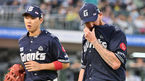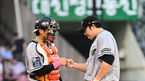 [OSEN=잠실, 조은정 기자]8일 잠실구장에서 2023 신한은행 SOL KBO리그 두산 베어스와 한화 이글스의 경기가 열렸다.2회말 무사 2루 한화 김민우가 두산 김재환에게 몸 맞는 공을 던지자 포수 박상언이 마운드에 올라 다독이고 있다. 2