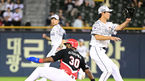 [OSEN=잠실, 김성락 기자] 9일 서울 잠실구장에서 2023 신한은행 SOL KBO리그 두산 베어스와 KIA 타이거즈의 경기가 열렸다.9회초 1사 만루 KIA 신범수의 병살타 때 두산 유격수 김재호가 1루 주자 최정용을 포스아웃 시킨 뒤 1루로 송구