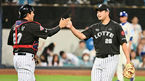[OSEN=대구, 이석우 기자] 9일 대구 삼성라이온즈파크에서 2023 신한은행 SOL KBO리그 삼성 라이온즈와 롯데 자이언츠의 경기가 열렸다. 롯데 자이언츠 진승현이 삼성 라이온즈에 5-1로 승리한 후 유강남의 축하를 받고 있다. 2023.06.09