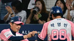 [OSEN=창원, 이석우 기자] 11일 창원 NC파크에서 2023 신한은행 SOL KBO리그 NC 다이노스와 SSG 랜더스의 경기가 열렸다. NC 다이노스 강인궘 감독이 SSG 랜더스에 8-4로 승리한 후 선수들과 기쁨을 나누고 있다. 2023.06.11 / foto0307@osen.co.kr