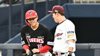 [OSEN=고척, 박준형 기자] 13일 오후 서울 고척스카이돔에서 2023 신한은행 SOL KBO리그 키움 히어로즈와 KIA 타이거즈의 경기가 진행됐다. 1회초 1사 군제대 복귀 첫 선발 나선 KIA 최원준이 안타를 날리고 이원석과 이야기를 나누고 있
