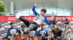 [OSEN=인천국제공항, 조은정 기자] 국제축구연맹(FIFA) 20세 이하(U-20) 월드컵 4강에 진출에 성공한 김은중호가 14일 인천국제공항을 통해 아르헨티나에서 귀국했다.U-20 대표팀이 김은중 감독 헹가래를 하고 있다. 2023.06.14 /cej@osen.co.k