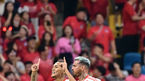 [OSEN=부산, 이석우 기자] 16일 부산 아시아드주경기장에서 하나은행 초청 축구 국가대표 친선경기 페루전이 열렸다. 페루 브라이언 레이나가 골을 넣고 세리머니를 하고 있다. 2023.06.16 / foto0307@osen.co.kr