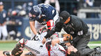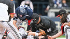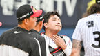 [OSEN=잠실, 박준형 기자] 17일 오후 서울 잠실구장에서 2023 신한은행 SOL KBO리그 LG 트윈스와 두산 베어스의 경기가 진행됐다.3회초 2사 2루 LG 허도환 포수가 목에 공을 맞은뒤 쓰러져 있다. 2023.06.17 / soul1014@osen.co.kr