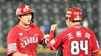 [OSEN=잠실, 민경훈 기자] 22일 오후 서울 잠실야구장에서 2023 신한은행 SOL KBO리그 두산 베어스와 SSG 랜더스의 경기가 열렸다.7회초 1사 SSG 최정이 우익수 오른쪽 2루타를 날린 후 2루에서 조동화 코치와 하이파이브를 하고 있다. 202