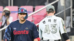 [OSEN=수원, 김성락 기자] 22일 오후 수원 KT위즈파크에서 ‘2023 신한은행 SOL KBO리그’ KT 위즈와 롯데 자이언츠의 경기가 열렸다.3회초 2사 2, 3루 롯데 유강남이 외야플라이로 물러나며 KT 투수 벤자민과 이야기를 나누고 있다. 2023.