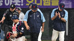 [OSEN=수원, 김성락 기자] 22일 오후 수원 KT위즈파크에서 ‘2023 신한은행 SOL KBO리그’ KT 위즈와 롯데 자이언츠의 경기가 열렸다.7회초 2사 1, 3루 롯데 서튼 감독이 KT 황재균의 파울 타구에 맞은 유강남의 상태를 살펴본 뒤 격려를