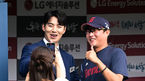 [OSEN=잠실, 지형준 기자] 24일 오후 서울 잠실야구장에서 ‘2023 신한은행 SOL KBO리그’ LG 트윈스와 롯데 자이언츠의 경기가 열렸다.롯데 박세웅이 이대형 해설위원과 포즈를 취하고 있다. 2023.06.24 /jpnews@osen.co.kr