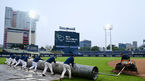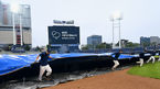 [OSEN=창원, 이석우 기자] 25일 창원 NC파크에서 2023 신한은행 SOL KBO리그 NC 다이노스와 한화 이글스의 경기가 열렸다. 비로 경기가 중단되자 구단 관계자들이 방수포를 덮고 있다. 2023.06.25 / foto0307@osen.co.kr