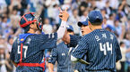 [OSEN=대구, 이석우 기자] 2일 대구 삼성라이온즈파크에서 2023 신한은행 SOL KBO리그 삼성 라이온즈와 한화 이글스의 경기가 열렸다. 삼성 라이온즈 박진만 감독이 한화 이글스를 2-1로 이기고 강민호와 하이파이브를 하며 활짝 웃