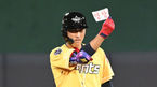 [OSEN=부산, 김성락 기자] 15일 오후 부산 사직야구장에서 ‘2023 신한은행 SOL KBO 올스타전’ 경기가 열렸다. 8회초 드림 올스타 유강남이 김수현 복장을 하고 타석에 들어서고 있다. 2023.07.15 /ksl0919@osen.co.kr