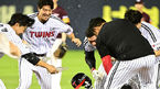 [OSEN=잠실, 조은정 기자] 3일 오후 서울 잠실야구장에서 ‘2023 신한은행 SOL KBO리그’ LG 트윈스와 키움 히어로즈의 경기가 열렸다.연장 12회말 2사 2,3루 LG 정주헌이 끝내기타를 때려낸 뒤 축하를 받고 있다. 2023.08.03 /cej@osen.co.kr