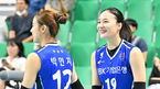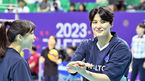 [OSEN=구미, 민경훈 기자] 3일 경상북도 구미시 박정희체육관에서 ‘2023 구미-도드람컵 프로배구대회’ IBK기업은행과 슈프림의 여자부 경기가 열렸다. 경기 전 IBK기업은행 표승주가 박민지와 악수를 나누고 있다. 2023.08.03 /rumi@ose