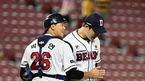 [OSEN=지형준 기자] 8일 오후 서울 잠실야구장에서 ‘2023 신한은행 SOL KBO리그’ 두산 베어스와 삼성 라이온즈의 경기가 열렸다.6회초 1사 1루에서 두산 최승용이 교체되며 박유연과 이야기를 나누고 있다. 2023.08.08 /jpnews@osen.co.kr