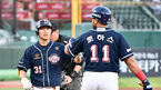 [OSEN=부산, 이석우 기자] 4일 부산 사직구장에서 2023 신한은행 SOL KBO리그 롯데 자이언츠와 두산 베어스의 경기가 열렸다. 두산 베어스 정수빈이 1회초 비디오 판독 끝에 폴대 맞고 홈런으로 인정된 후 하이파이브를 하고 있다. 202