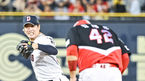 [OSEN=잠실, 박준형 기자] 7일 오후 서울 잠실야구장에서 ‘2023 신한은행 SOL KBO리그’ 두산 베어스와 KIA 타이거즈의 경기가 진행됐다.3회초 1사 1루 KIA 최원준의 병살타때 두산 김재호 유격수가 1루 주자 김태군을 포스아웃시킨뒤 1
