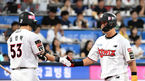 [OSEN=수원, 이대선 기자] 7일 오후 수원 KT위즈파크에서 2023 신한은행 SOL KBO리그 KT 위즈와 LG 트윈스의 경기가 열렸다.2회말 1사 1,3루에서 KT 박경수의 적시타 때 홈을 밟은 3루주자 배정대가 홈에서 김민혁과 하이파이브를 하고 있
