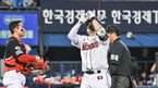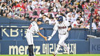 [OSEN=잠실, 박준형 기자] 7일 오후 서울 잠실야구장에서 ‘2023 신한은행 SOL KBO리그’ 두산 베어스와 KIA 타이거즈의 경기가 진행됐다.2회말 두산 선두타자 양석환이 선취 솔로홈런을 날리고 세리머니를 하며 홈을 밟고 있다. 2023.09