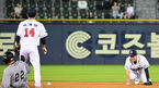 [OSEN=김성락 기자] 12일 오후 서울 잠실야구장에서 ‘2023 신한은행 SOL KBO리그’ 두산 베어스와 한화 이글스의 경기가 진행됐다.5회초 무사 1, 2루 한화 윌리엄스의 병살타 때 두산 2루수 박계범이 1루 주자 최인호를 포스아웃시킨