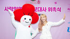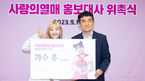 [OSEN=김성락 기자] 14일 오후 서울 중구 사랑의열매 사회복지공동모금회에서 가수 츄의 ‘사랑의 열매’ 홍보대사 위촉식 행사가 열렸다. 가수 츄, 황인식 사무총장이 취재진을 향해 포즈를 취하고 있다. 2023.09.14 /ksl0919@osen.co.kr