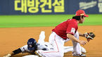 [OSEN=잠실, 김성락 기자] 14일 오후 서울 잠실야구장에서 ‘2023 신한은행 SOL KBO리그’ 두산 베어스와 SSG 랜더스의 경기가 진행됐다.9회말 무사 1, 2루 두산 이유찬의 투수 앞 땅볼 때 2루 주자 박지훈이 3루에서 포스아웃 되고 있다