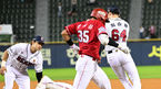 [OSEN=잠실, 김성락 기자] 14일 오후 서울 잠실야구장에서 ‘2023 신한은행 SOL KBO리그’ 두산 베어스와 SSG 랜더스의 경기가 진행됐다.5회초 2사 1루 SSG 최정의 타석 때 1루 주자 최지훈이 런다운에 걸려 두산 1루수 강승호에게 태그