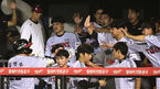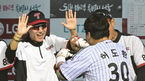 [OSEN=잠실, 김성락 기자] 17일 오후 서울 잠실야구장에서 ‘2023 신한은행 SOL KBO리그’ LG 트윈스와 SSG 랜더스의 DH 2차전 경기가 열렸다. 4회말 1사 LG 허도환이 솔로 홈런을 날린 뒤 더그아웃에서 염경엽 감독과 기쁨을 나누고 있다.