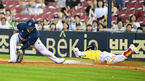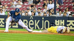 [OSEN=잠실, 지형준 기자] 19일 오후 서울 잠실야구장에서 ‘2023 신한은행 SOL KBO리그’ 두산 베어스와 NC 다이노스의 경기가 열렸다. 3회말 1사 1루에서 두산 조수행이 기습 번트를 날리고 NC 윤형준에 앞서 헤드퍼스트슬라이딩으