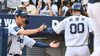 [OSEN=창원, 이석우 기자] 24일 창원 NC파크에서 2023 신한은행 SOL KBO리그 NC 다이노스와 두산 베어스의 경기가 열렸다. NC 다이노스 강인권 감독이 8회말 2사 1,3루 두산 베어스 홍건희 폭투로 득점을 올린 박영빈과 기쁨을 나누고 있