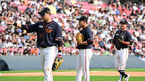 [OSEN=고척, 박준형 기자] 류중일 감독이 이끄는 항저우 아시안게임 야구 대표팀이 24일 오후 서울 고척스카이돔에서 공식훈련을 가졌다.장현석과 나균안이 이야기를 나누고 있다. 2023.09.24 / soul1014@osen.co.kr