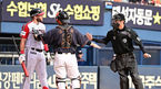 [OSEN=잠실, 지형준 기자] 24일 오후 서울 잠실야구장에서 ‘2023 신한은행 SOL KBO리그’ LG 트윈스와 한화 이글스의 경기가 열렸다.6회말 2사에서 LG 오스틴이 주현상의 몸쪽 볼에 신경질적 반응을 보이자 최재훈이 말리고 있다. 2023.
