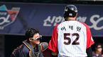 [OSEN=잠실, 지형준 기자] 24일 오후 서울 잠실야구장에서 ‘2023 신한은행 SOL KBO리그’ LG 트윈스와 한화 이글스의 경기가 열렸다.5회말 무사 1루에서 한화 최재훈이 LG 이재원의 헛스윙 삼진에 돌아가는 배트에 맞고 괴로워하고 있