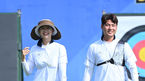 [OSEN=항저우(중국), 김성락 기자] 2일 오전 중국 항저우 푸양 인후 스포츠센터에서 '제19회 항저우아시안게임' 양궁 컴파운드 혼성 16강전 경기가 열렸다.대한민국 소채원, 주재훈이 기쁨을 나누고 있다. 2023.10.02 / ksl0919@osen.co.kr
