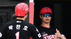 [OSEN=수원, 조은정 기자] 4일 오후 경기도 수원 KT위즈파크에서 ‘2023 신한은행 SOL KBO리그’ KT 위즈와 KIA 타이거즈의 더블헤더 1차전이 열렸다.4회초 2사 2루 KIA 소크라테스의 2타점 2루타에 득점을 올린 박찬호가 김종국 감독의 축