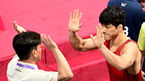 [OSEN=항저우(중국), 최규한 기자] 4일 오전 중국 항저우 린안 스포츠문화전시센터 ‘2022 항저우 아시안게임’ 남자 레슬링 그레코로만형 77㎏급 8강 경기가 열렸다.한국 김현우가 경기를 앞두고 코칭스태프와 하이파이브를 나누