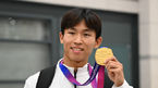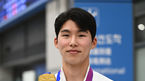 [OSEN=인천공항, 조은정 기자] 2022 항저우 아시안게임을 마친 축구 대표팀이 8일 인천국제공항을 통해 귀국했다.축구대표팀 정우영이 금메달을 들고 포즈를 취하고 있다. 2023.10.08 /cej@osen.co.kr
