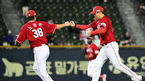 [OSEN=잠실, 조은정 기자] 16일 오후 서울 잠실야구장에서 ‘2023 신한은행 SOL KBO리그’ 두산 베어스와 SSG 랜더스의 경기가 열렸다.8회말 2사 SSG 노경은이 두산 조수행에게 땅볼을 이끌어내며 이닝을 마친 뒤 한유섬과 기뻐하고 있