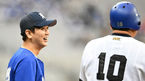[OSEN=고척, 이대선 기자] ‘2023 노브랜드배 고교동창 야구대회 올스타전’이 28일 서울 고척스카이돔에서 열렸다.5회말 피코크 심수창이 출루한 노브랜드 양준혁과 이야기를 나누고 있다. 2023.10.28 /sunday@osen.co.kr