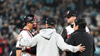[OSEN=수원, 이대선 기자] 31일 오후 수원 KT위즈파크에서 ‘2023 신한은행 SOL KBO 포스트시즌 플레이오프’ 2차전 KT 위즈와 NC 다이노스의 경기가 열렸다.3회초 1사 1,2루에서 마운드를 방문한 KT 김태한 코치가 장성우, 벤자민과 이야