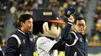 [OSEN=잠실, 이대선 기자] 7일 오후 서울 잠실야구장에서 2023 KBO 프로야구 포스트시즌 한국시리즈 1차전 LG 트윈스와 KT 위즈의 경기가 열렸다.1994년 우승 주역 전 LG 투수 김용수와 포수 김동수가 한국시리즈 1차전 시구를 마치고 인