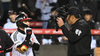 [OSEN=잠실, 이석우 기자] 7일 잠실야구장에서 2023 신한은행 SOL KBO 포스트시즌 한국시리즈 LG 트윈스와 KT 위즈의 1차전 경기가 열렸다.LG 트윈스 문성주가 4회초 무사 1루 몸에 맞는 볼을 주장하고 있다. 2023.11.07 / foto0307@osen.co.kr