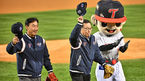 [OSEN=잠실, 이석우 기자] 7일 잠실야구장에서 2023 신한은행 SOL KBO 포스트시즌 한국시리즈 LG 트윈스와 KT 위즈의 1차전 경기가 열렸다.1994년 우승 주역 김용수와 김동수가 한국시리즈 1차전 시구와 시타를 마치고 팬들에게 인사를