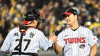 [OSEN=잠실, 이석우 기자] 8일 잠실야구장에서 2023 신한은행 SOL KBO 포스트시즌 한국시리즈 LG 트윈스와 KT 위즈의 2차전 경기가 열렸다.LG 트윈스 박동원이 5-4로 역전승 한 후 염경엽 감독과 기쁨을 나누고 있다. 2023.11.08 / foto0307@osen