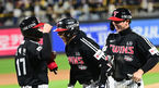 [OSEN=수원, 지형준 기자] 10일 오후 수원 KT위즈파크에서 ‘2023 신한은행 SOL KBO 포스트시즌 한국시리즈’ 3차전 KT 위즈와 LG 트윈스의 경기가 열렸다.3회초 2사 2,3루에서 LG 오스틴이 선제 스리런포를 날리고 더그아웃에서 동료선