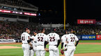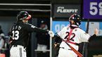 [OSEN=수원, 지형준 기자] 10일 오후 수원 KT위즈파크에서 ‘2023 신한은행 SOL KBO 포스트시즌 한국시리즈’ 3차전 KT 위즈와 LG 트윈스의 경기가 열렸다.1회초 무사에서 LG 홍창기가 중전 안타를 날리고 세리머니를 하고 있다. 2023.11.10