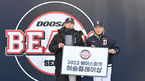 [OSEN=잠실, 조은정 기자]25일 서울 잠실구장에서 '2023 곰들의 모임' 행사가 열렸다.두산 이승엽 감독이 홍성호에게 2023 베어스파크 허슬플레이어 시상 후 포즈를 취하고 있다. 2023.11.25 /cej@osen.co.kr