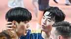 [OSEN=장충체육관, 박준형 기자] 7일 오후 서울 장충체육관에서 도드람 2023-2024 V리그 남자부 우리카드와 대한항공의 경기가 진행됐다.2세트 우리카드 김지한이 블로킹 성공한 이상현을 바라보며 놀란 표정을 짓고 있다. 2023.12.07 /