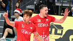 [OSEN=지형준 기자] 20일 오후 서울 장충체육관에서 도드람 2023-2024 V리그 남자부 우리카드와 현대캐피탈의 경기가 열렸다.2세트 우리카드 한성정, 마테이가 득점에 기뻐하고 있다. 2023.12.20 / jpnews.osen.co.kr