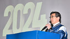 [OSEN=창원, 이석우 기자] 8일 창원 종합운동장 올림픽기념관공연장에서 2024년 NC다이노스 신년회가 열렸다.NC 다이노스 이진만 대표가 2024년 캐치프레이즈 ‘THE ROAD TO GREATNESS’를 발표하고 있다. 2024.01.08 / foto0307@osen.co.kr
