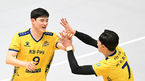 [OSEN=의정부, 김성락 기자] 9일 오후 경기도 의정부체육관에서 ‘도드람 2023-2024 V-리그’ KB손해보험과 대한항공의 경기가 열렸다.1세트 KB 홍상혁이 블로킹에 성공한 뒤 리우훙민과 기쁨을 나누고 있다. 2024.01.09 /ksl0919@osen.co.kr